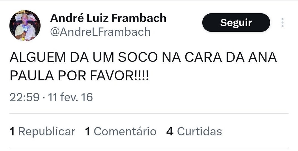 A internet é um território onde nada se apaga. Sendo assim, os usuários desenterraram um tuíte de 2016 onde André sugere violência física contra Ana Paula Renault.